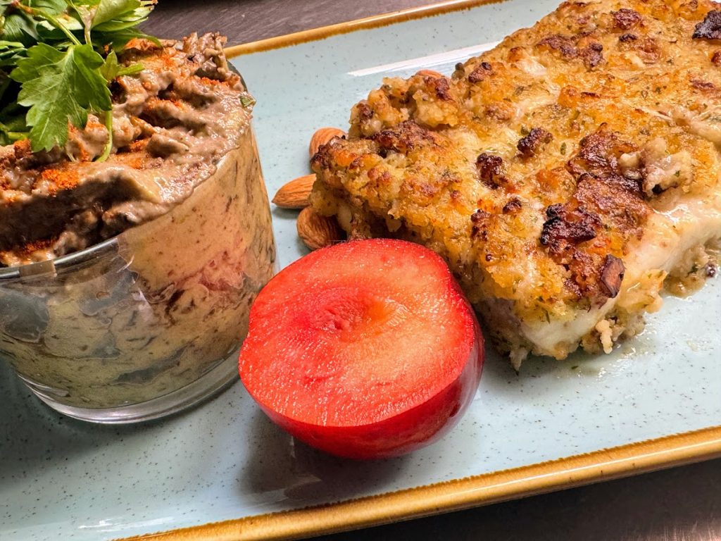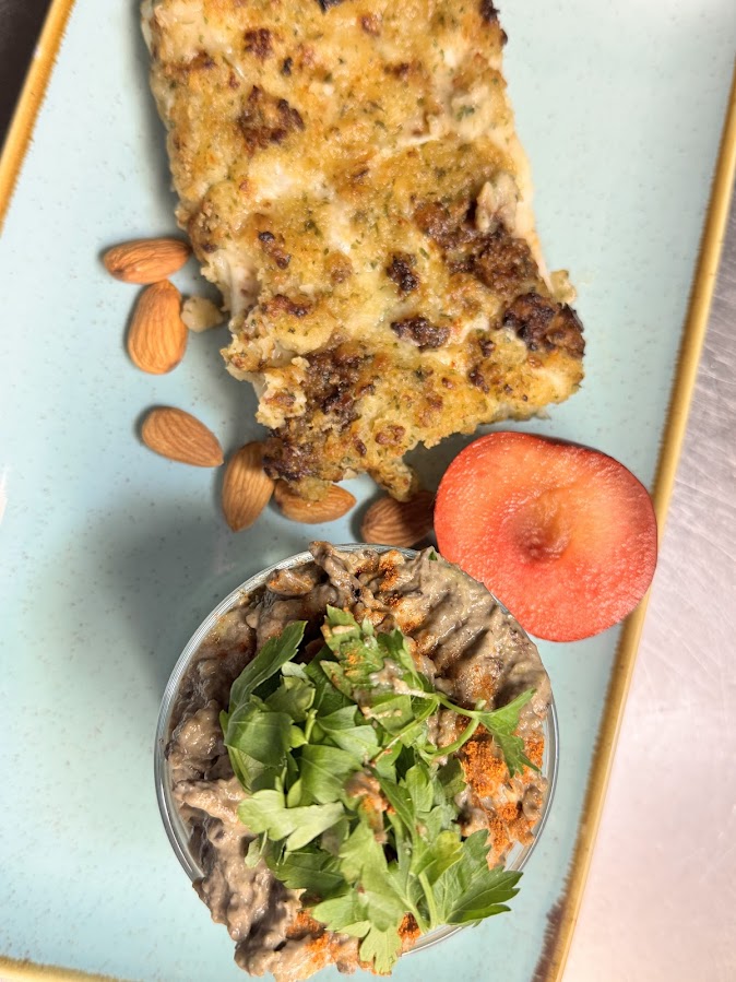 Picked up a small piece of cheap whitefish, made a cool spicy crunchy “top” and a 2 avocado and mayo dip.