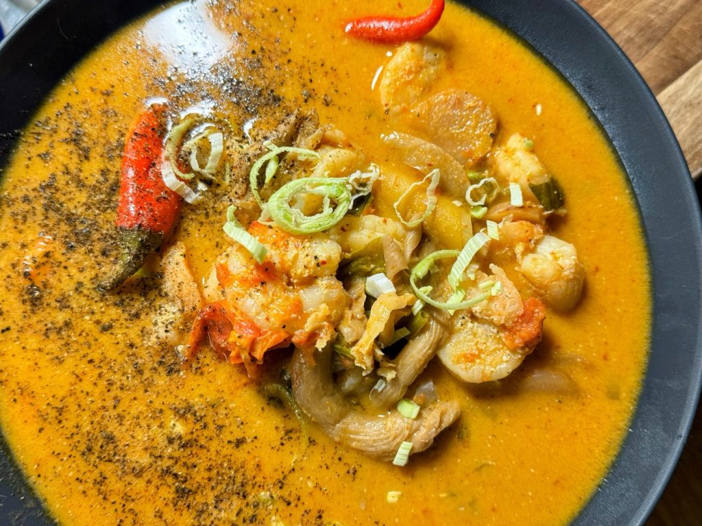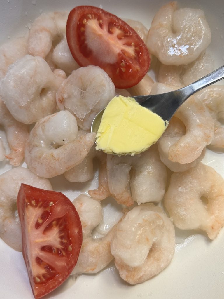 With a huge bag of frozen prawns and loads of spices and peppers and all the shit…seriously great…